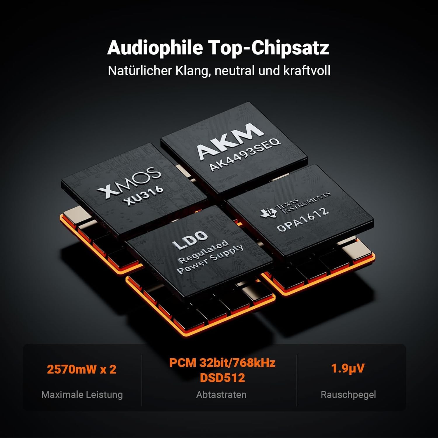 Premium-Chipsatz mit AKM4493SEQ DAC, XMOS XU316-Prozessor und vier OPA1612-Verstärkern unterstützt bis zu PCM 768 kHz/32 Bit und DSD512.