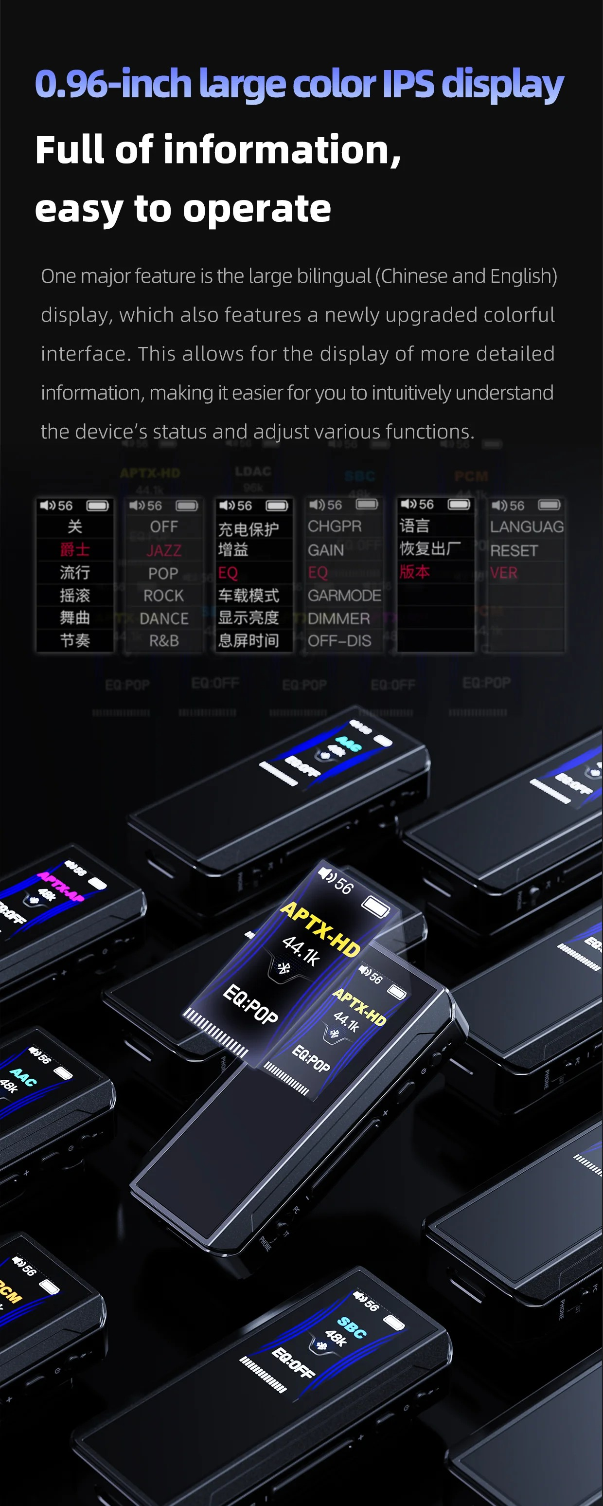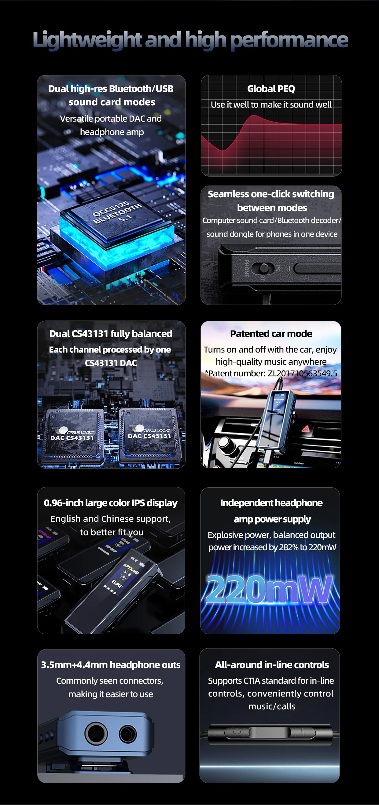 Zwei hochwertige CS43131-DACs, 0,96 Zoll großes Farb-IPS-Display, patentierter Kartenmodus, unterstützt Mikrofone und Inline-Steuerelemente, unterstützt App-Steuerung, unterstützt UAC1.0-Modus