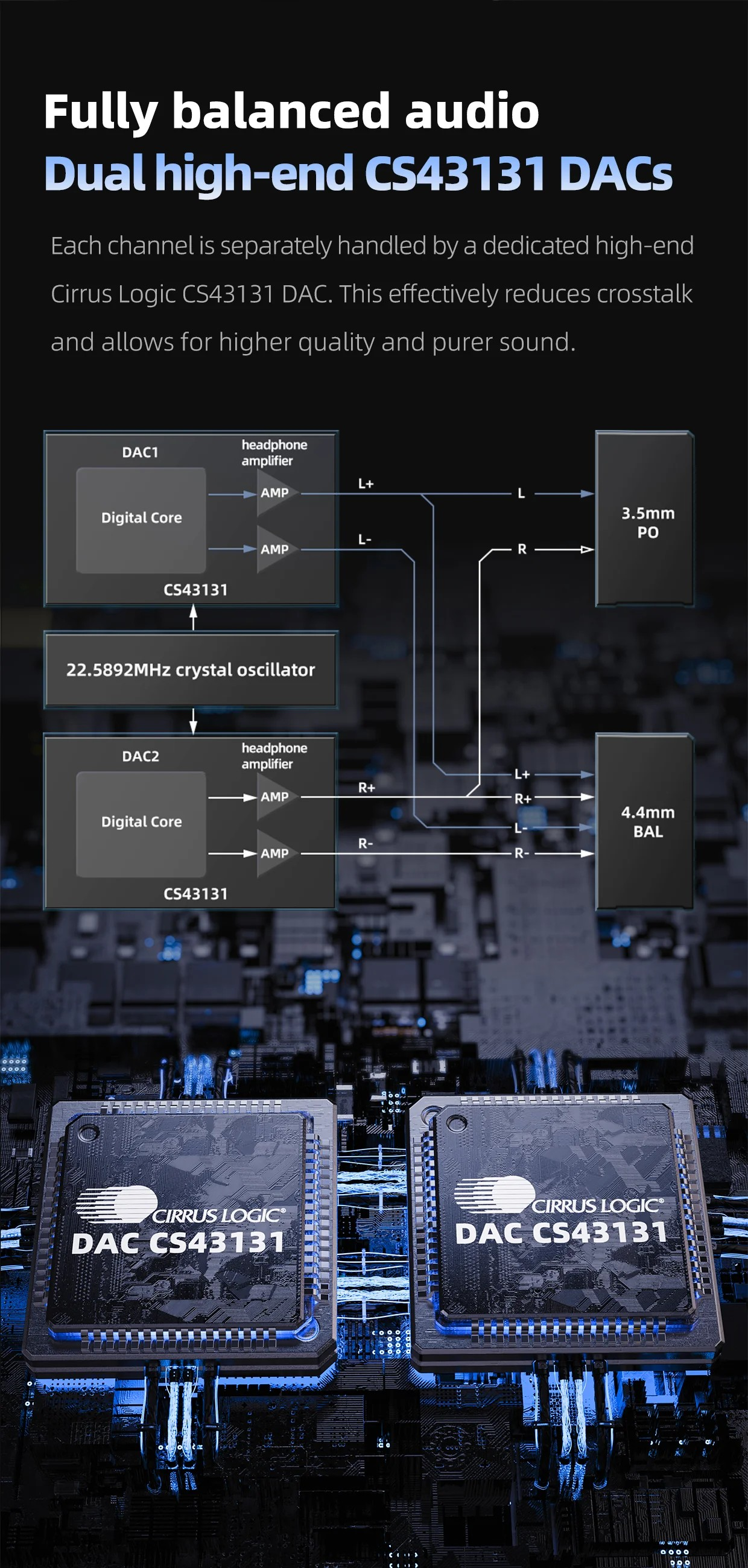 - Jeder Kanal wird von einem CS43131 DAC verarbeitet