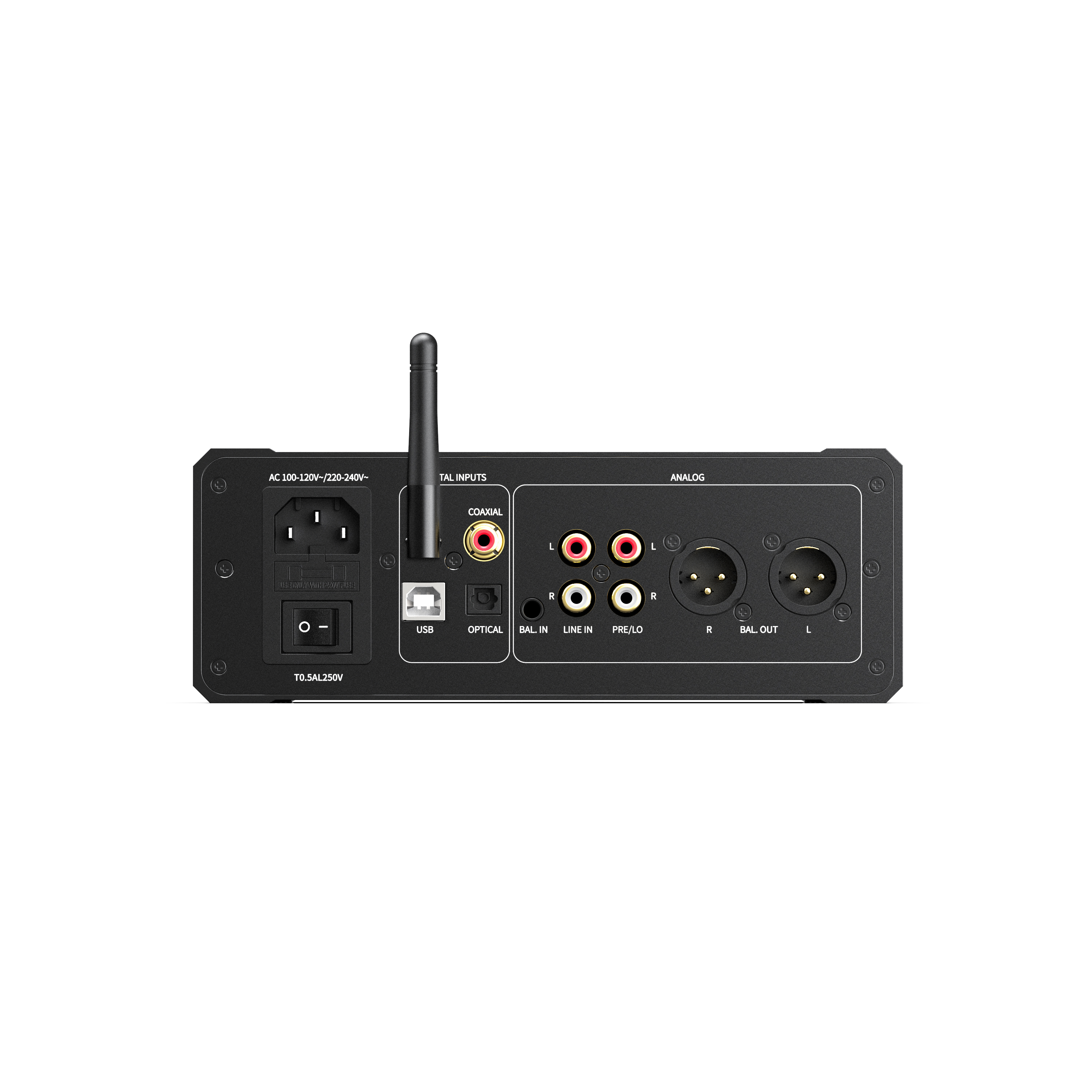 - Eingänge: USB/OPT/COAX/RCA/4,4mm