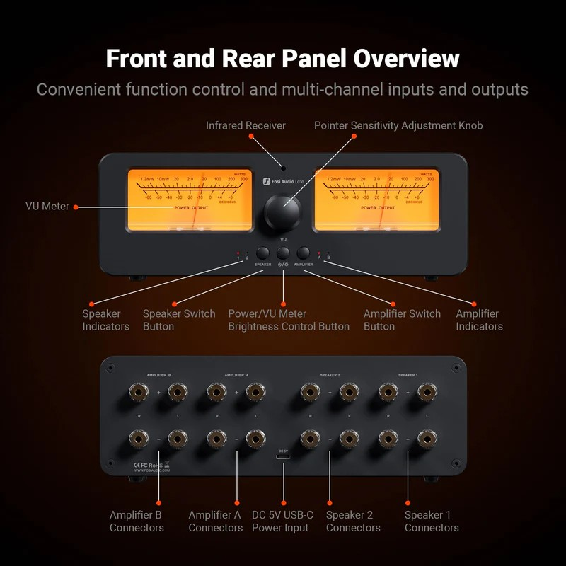 Es rationalisiert den Prozess der A/B-Vergleichstests für zwei Verstärker oder Lautsprecher und gewährleistet eine einfache Zugänglichkeit.