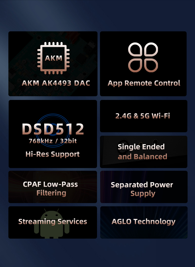 Dank AGLO (Android Global Lossless Output) wird die Musik von allen Apps korrekt und in voller Qualität verarbeitet, ohne dass es zu einer Verschlechterung durch die Android-Prozesse kommt.