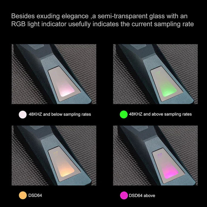 Auf der Vorderseite des DTC500 befindet sich innerhalb des Glasfensters eine mehrfarbige RGB-Lichtanzeige. Sie leuchtet je nach aktiver Audiosignal-Bitrate in verschiedenen Farben, z. B. Weiß für Bitraten unter 48 kHz, Grün für 48 kHz und darüber, Goldgelb für DSD64 und Magenta für Signale über DSD64.