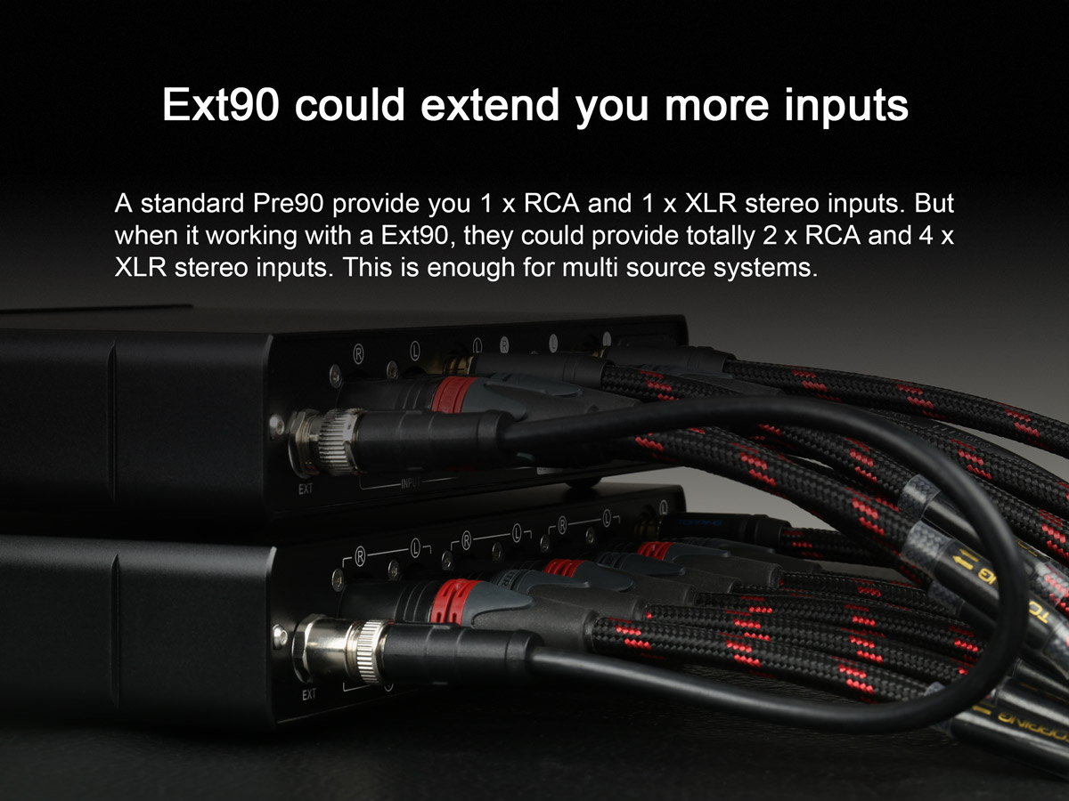 Oder Sie erweitern Ihren Topping Kosmos um den Topping EXT90 und haben so zusätzlich drei weitere Stereo XLR und einen weiteren Stereo Cinch Eingang.