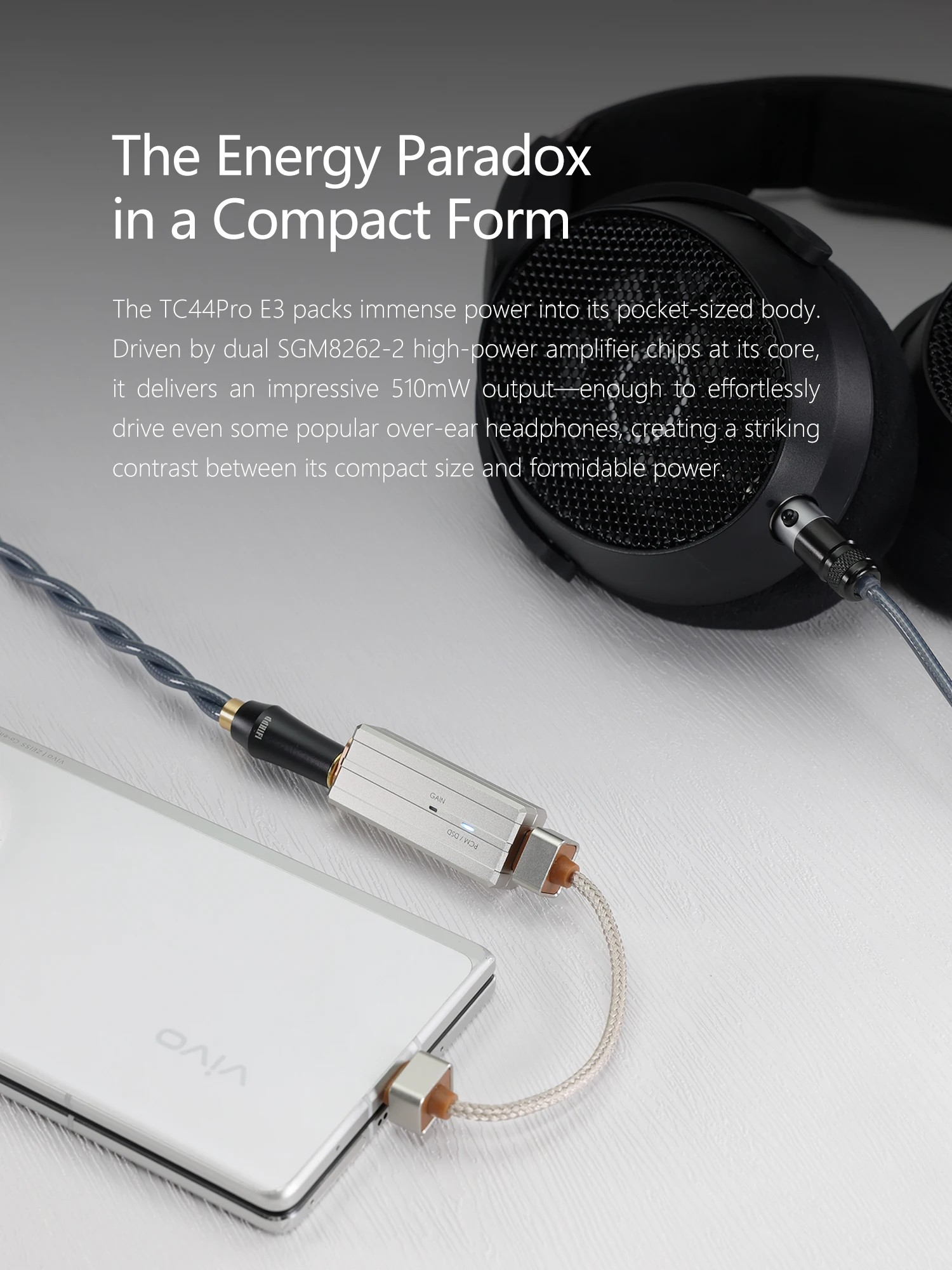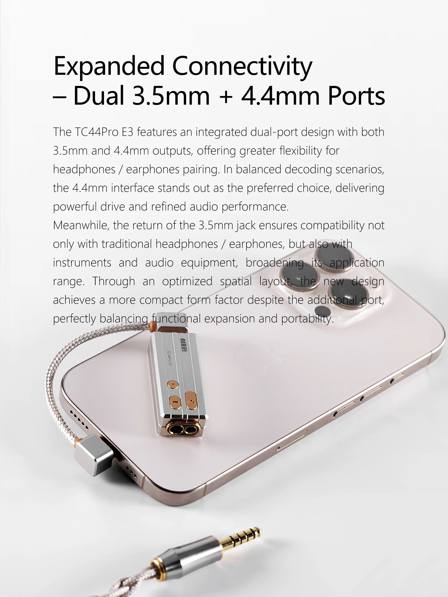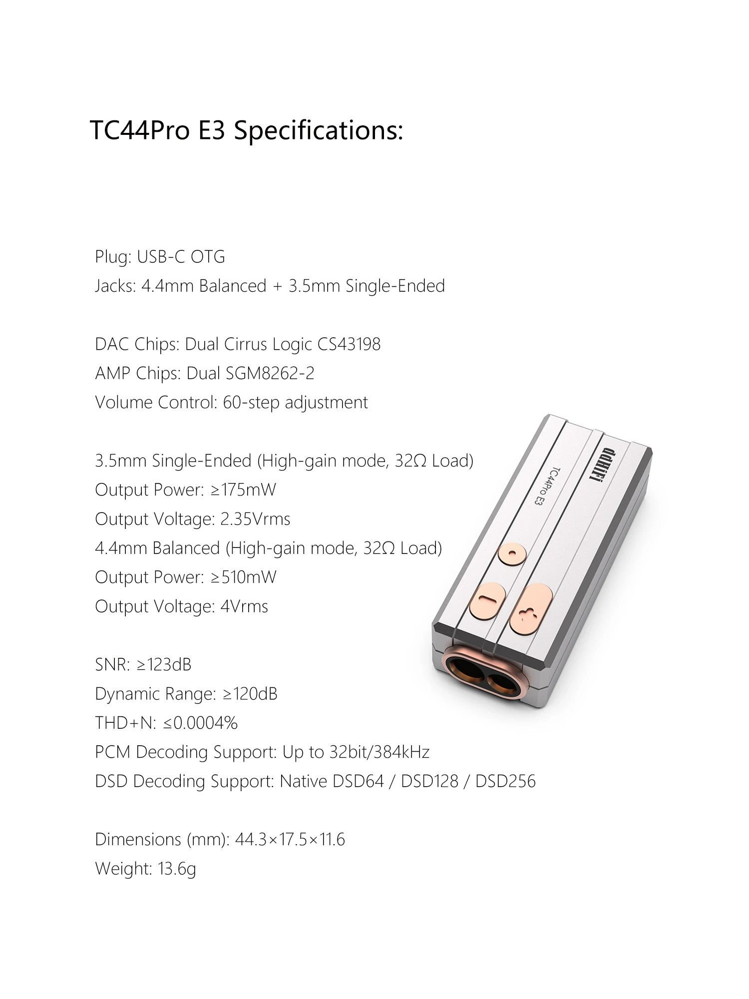 Perfekt für Audiophile und Profis, die einen kompakten, leistungsstarken DAC/AMP-Adapter brauchen. Mit seinen fortschrittlichen Dual-DAC-Chips, der starken Verstärkung und den flexiblen Anschlussmöglichkeiten bietet der TC44Pro E3 überall eine außergewöhnliche Audioleistung. Egal, ob du ihn für Musik, Gaming oder Live-Streaming verwendest, der TC44Pro E3 sorgt für ein nahtloses, hochauflösendes Hörerlebnis.